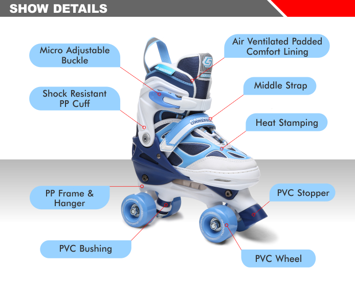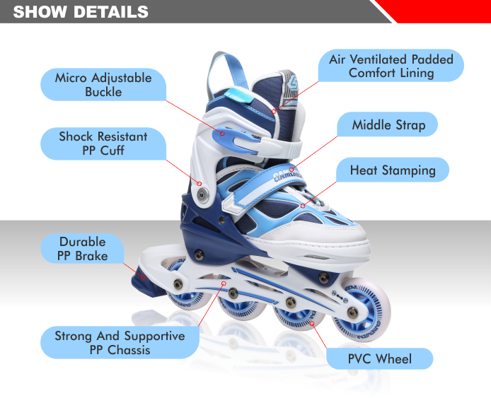 | WHEEL SIZE: | INLINE: 31-34: 64X24MM, 35-38:70X24MM, 39-42: 72X24MM QUAD: 54X32MM |